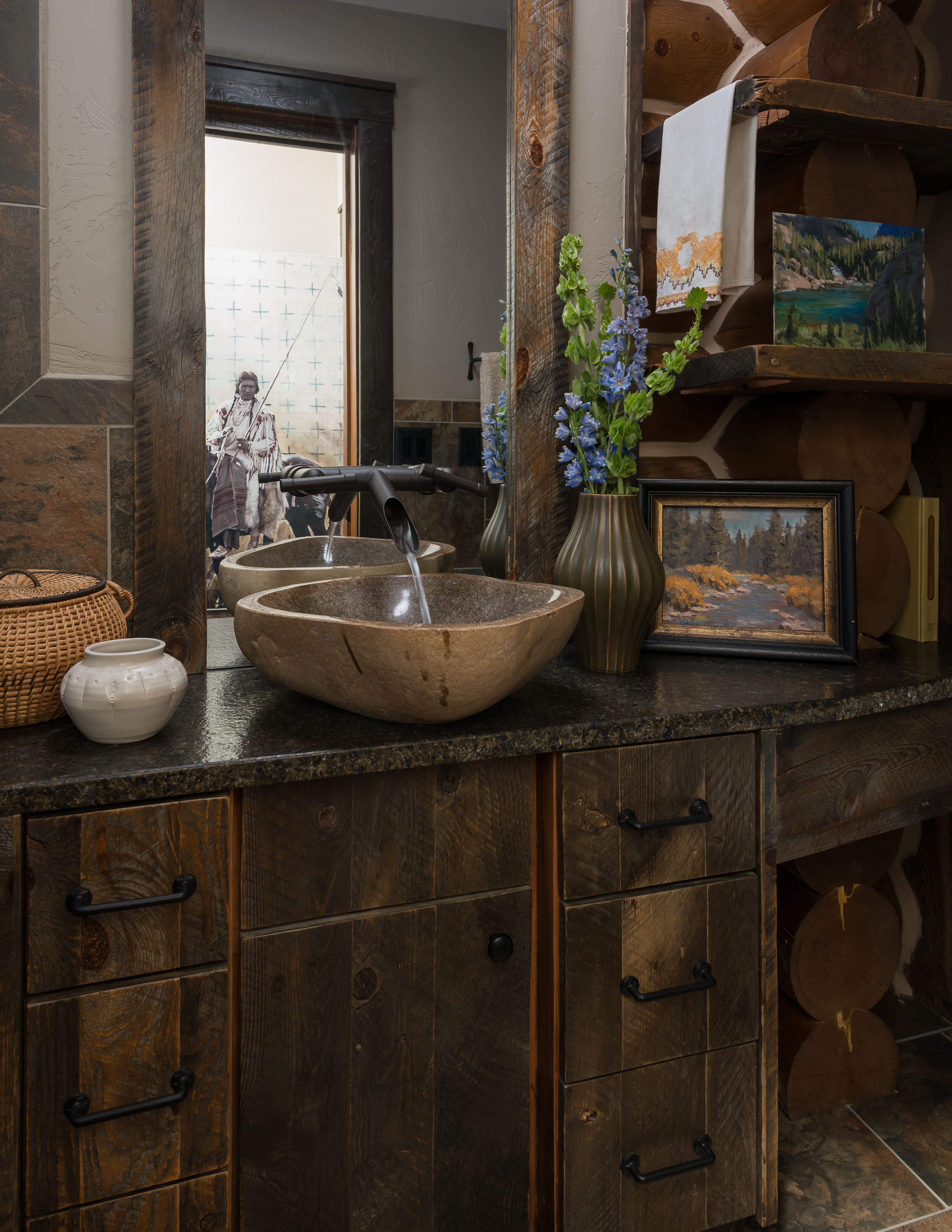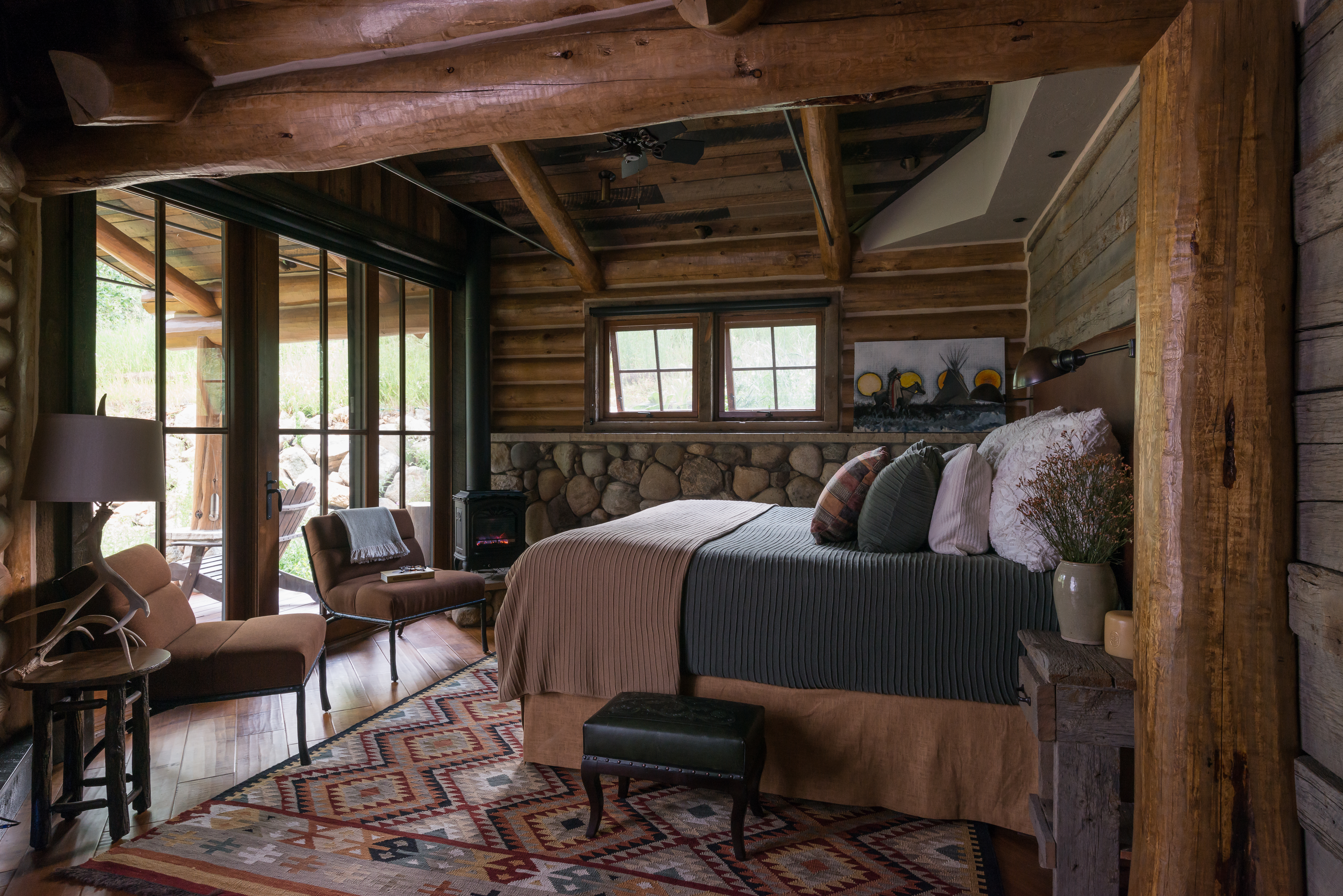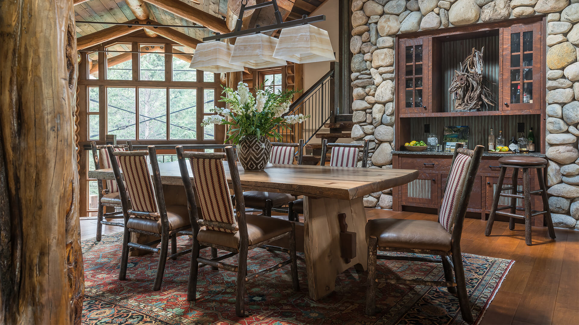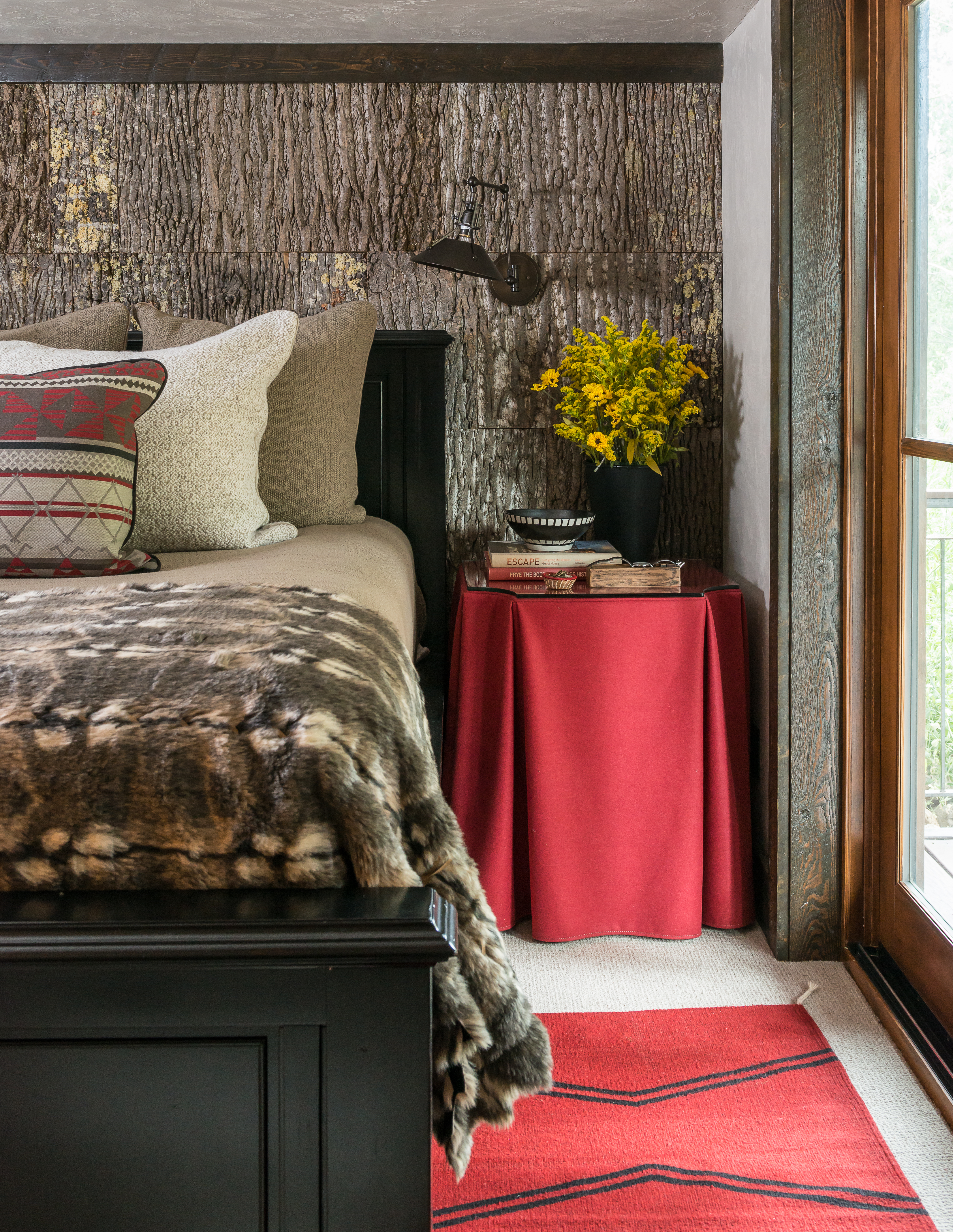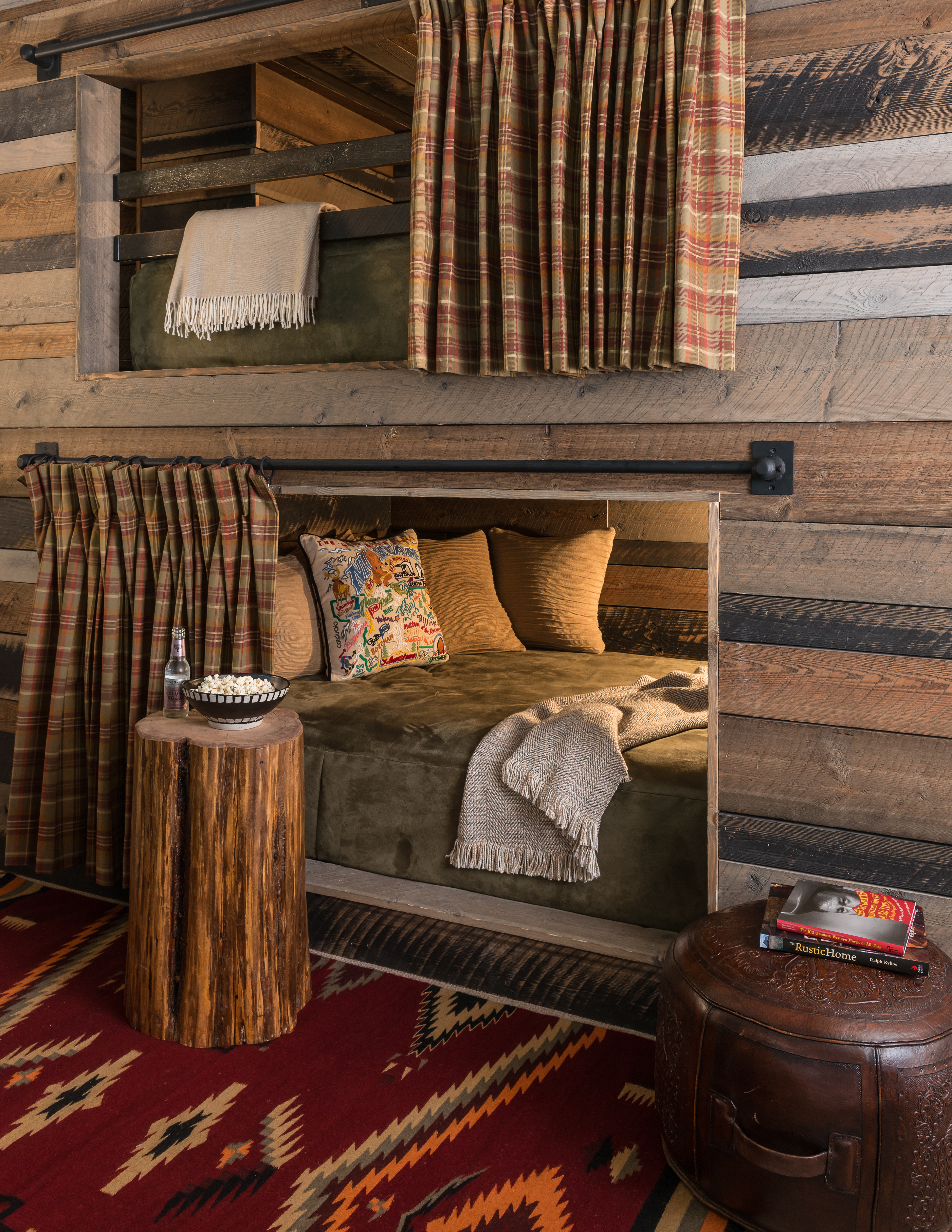 In a family home meant to foster relationships during winter ski trips and summer idylls, our task was to create a sense of timeless, sophisticated, western-leaning comfort. In this log home with wood floors, wood cabinetry, barnwood details, and river rock fireplaces and walls, the interiors are more dynamic than is apparent at first glance. The ceilings, which extend out under the overhangs for a seamless indoor/outdoor experience, are surprisingly colorful. To make a strong visual statement while helping delineate the kitchen from the great room, we commissioned a dramatic wood and steel hood from a local craftsman. We accessorized with Navajo rugs, patterned upholstery, red accents in throws and pillows, organic wood pieces, and vibrant contemporary western art. Bedrooms gave us a chance to flex our creativity.  In one, a textured plaster wall painted red creates a rich backdrop for patterned textiles and an iron bedstead. In another, a tailored red skirt on a glass-topped bedside table pops against a natural bark wall with lichen. In the bunkroom, four built-in sleeping compartments with privacy curtains on iron rods create a sense of adventure for kids while still offering the utmost in comfort for adults.